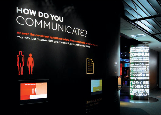Communication exhibition uses an environmental narrative approach and hands-on activities to disseminate the content. This exhibition incorporates full-body immersive environments, electromechanical and multimedia interactives in four themed content zones: Body and Language; Symbols, Signs and Writing; Digital Media and Content; Signals and Networks.