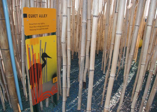 An experiment in rapid exhibition prototyping and developing, Wildlife Challenge was developed, designed and installed within 100 days, using unconventional exhibition design tactics. The graphic designer graffiti spray painted the graphic panels. A cast of volunteers weaved twigs and branches over several weekends to create a man-made thicket. Team members harvested the bamboo stalks from a local bamboo forest and foraged the twigs and branches from the Liberty State Park. A departure from the conventional graphic standards, the interpretation texts were written in Haiku.