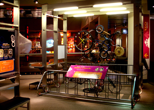 Barricaded by bike racks is the Bike clock, a clock built from junkyard bikes. Nearby, visitors can experiment with how gears work as they try to devise a way to connect a crank to move the hands of a clock.