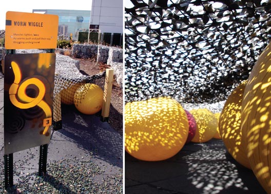 The resulting exhibition was bold, bright, and richly textured. The contrast between urban and nature was reflected in the use of materials - tree stumps and bamboo juxtapose with reclaimed concrete and plastic sewer pipes. Aluminum graphic panels mounted like road signs, punctuating the natural landscape, introducing each new activity and directing traffic through the obstacle course.