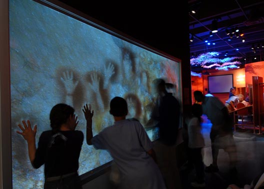 The handprint left on a cave wall is the first known human mark of communication. An interactive digital handprint wall uses sensor technology to read and spray the outline of each visitor's hand when they touch the wall.