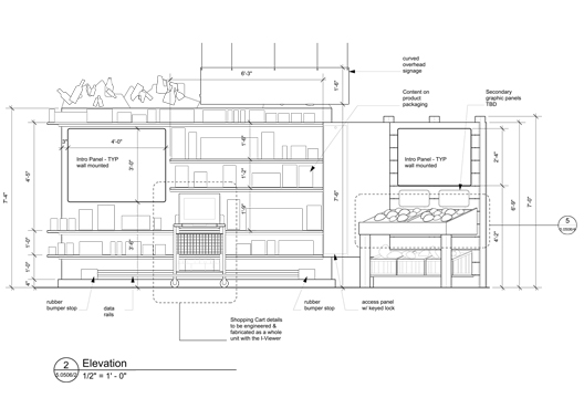 Familiar consumer products line the shelves of this Supermarket; next to the shelves are produce bins. Shopping cart has a screen that "reads" the products and provides the visitor/shopper information on the product's carbon footprint.