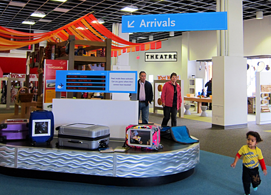 Within the Map Zone's "Pack Your Bag" exhibit, an airport luggage carousel introduces visitors to the different reasons people travel and demonstrates that what people pack is determined by the type of environment they will visit.
