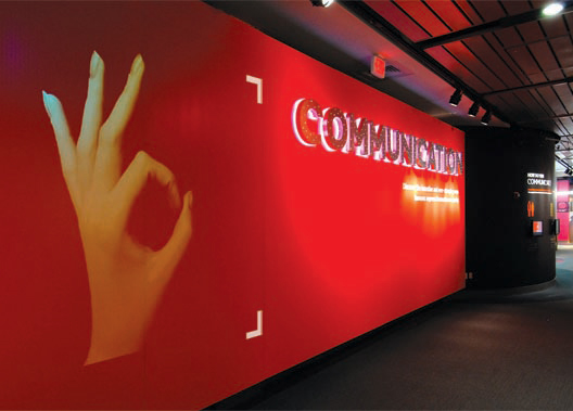 Communication exhibition uses an environmental narrative approach and hands-on activities to disseminate the content. This exhibition incorporates full-body immersive environments, electromechanical and multimedia interactives in four themed content zones: Body and Language; Symbols, Signs and Writing; Digital Media and Content; Signals and Networks.