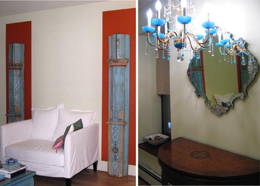 Hand carved pillars and Venetian chandelier and mirror show off the client's eclectic style.