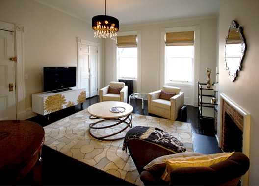 Fun and bold patterns on the TV cabinet and the rug give subtle hints of the client's personality. The modern crystal chandelier adds a touch of fancy in the room.
