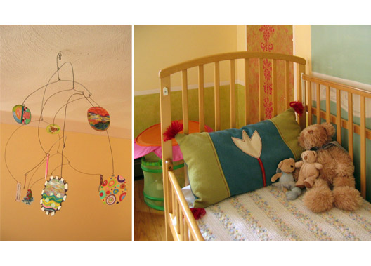 A "rococo style" nursery that would grow up with the child into her teens. Various paint techniques and whimsical details create a room of playful colors and textures.