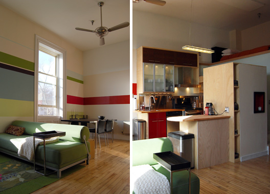 A light filled loft studio apartment in a converted factory building that is a registered historical landmark. The space was gutted and renovated to create a spa bathroom, a modern open kitchen, and a sleeping alcove. The design features many creative storage solution for this small apartment, and accentuates its 12' ceiling and the large factory windows.