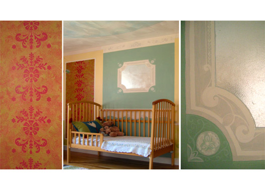 A "rococo style" nursery that would grow up with the child into her teens. Various paint techniques and whimsical details create a room of playful colors and textures.