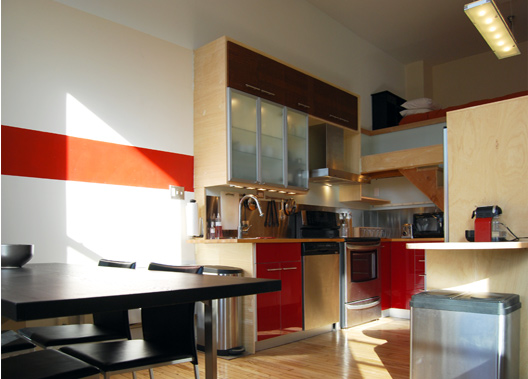 A light filled loft studio apartment in a converted factory building that is a registered historical landmark. The space was gutted and renovated to create a spa bathroom, a modern open kitchen, and a sleeping alcove. The design features many creative storage solution for this small apartment, and accentuates its 12' ceiling and the large factory windows.